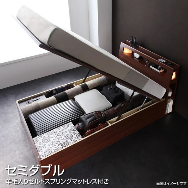 ベッド 組み立て サービス セミダブル 跳ね上げ式 深さラージ 縦開き 羊毛入りゼルトスプリングマットレス付き セミダブルベッド ベット せみだぶる 日本製 大容量 収納付 収納付きベッド 棚付き コンセント付き ベッド下 布団収納 大型収納ベッド ガス圧 おしゃれ